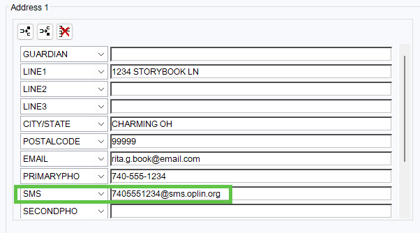 - Addresses Tab: In the Address 1 SMS field, enter the patron's 10-digit mobile phone number followed by @sms.oplin.org. Do not include hyphens or spaces in the phone number.
