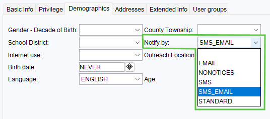 - Demographics Tab: In the Notify by field, select: