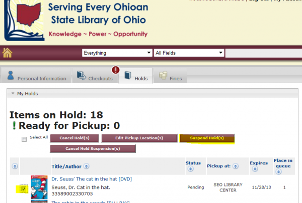 - Click on the Suspend Hold(s)button displayed at the top (or bottom) of your holds list