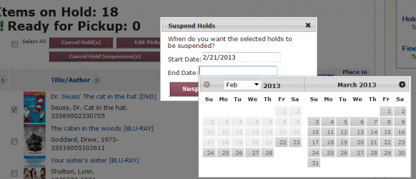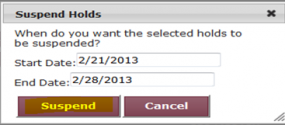 If only a start date is entered, but no end date is chosen, the hold will be suspended indefinitely. If no end date is entered, the suspension will remain in place. So be sure to include an end date when suspending holds.