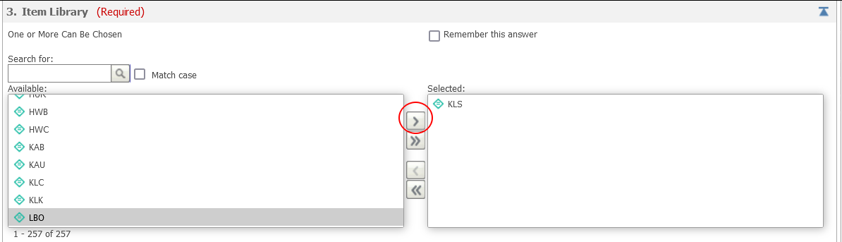 3. In the prompts, click on your library code and single chevron arrow to bring the library to the selected column.