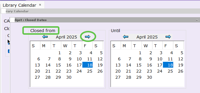 - If the library is closed for more than a single day, choose the first date closed on the Closed From side of the calendar. Choose the last day closed on the Until side of the calendar. Click on Add.