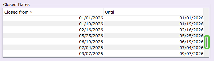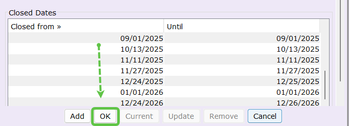 Changes to the dates in the Closed Dates list can be made. Select any date in the list to make the change and then click on the Update button. When done, click on the OK button and then the Save button.