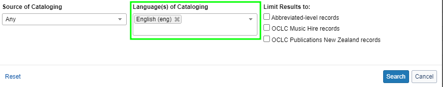 4. Before performing a search in WorldShare Record Manager, you can limit the search to only English records by using the Advanced Search feature and selecting English (eng) in the Language(s) of Cataloging option: