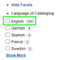 3. After performing a search, use the Language of Cataloging facet to limit to English.