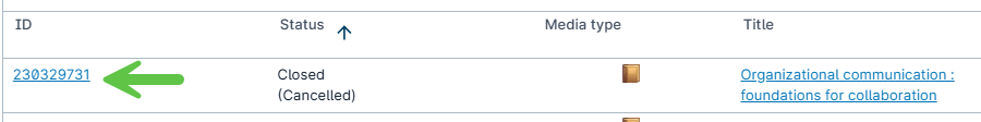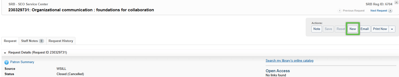 Ordering an Unfilled or Previously Ordered Item Modified on: Tue, 3 Jun, 2025 at 3:28 PM Click on the Closed Request radio button. Enter your Borrower Symbol. Click the Search icon.Click on the ID of an item to reorder.Click New.Click Save for Review.You will receive a confirmation that the item was requested.