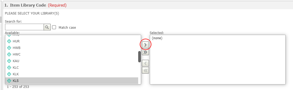 - In the Item Library Code prompt, click on your library code and click the single chevron arrow to bring the library to the Selected Column.