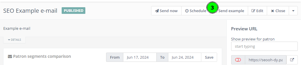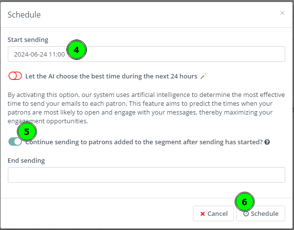 - Toggle Continue sending to patrons to the segment after sending has started? to on (green).