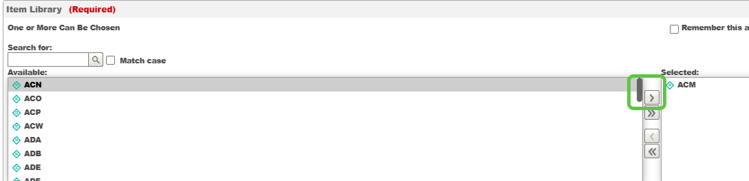 2. In the prompts, click on your library code and single chevron arrow to bring the library to the selected column.